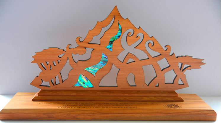 The salon trophy presented to the winner was designed by Lesley Sales FPSNZ. The trophy known as “Wind and Water” symbolizes the essence of the New Zealand landscape: water, wind, trees and light. Lesley says the outline shape suggests a mountain and the forces acting upon it to carve out the landscape. Mountain streams flowing down the mountain sides are depicted by internal cut-out lines.