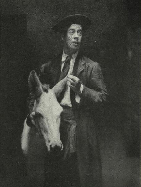Faced with the problems of back ground and lighting difficulties, ‘Caz’ decided to take this picture by day light in the lane way at the side of the theatre. It shows Fred Bluett and his donkey at the time when he was playing in the musical comedy “Wild flower”. During the same season he photographed "Wildflowers" leading lady, Marie Burke, with her parrot.