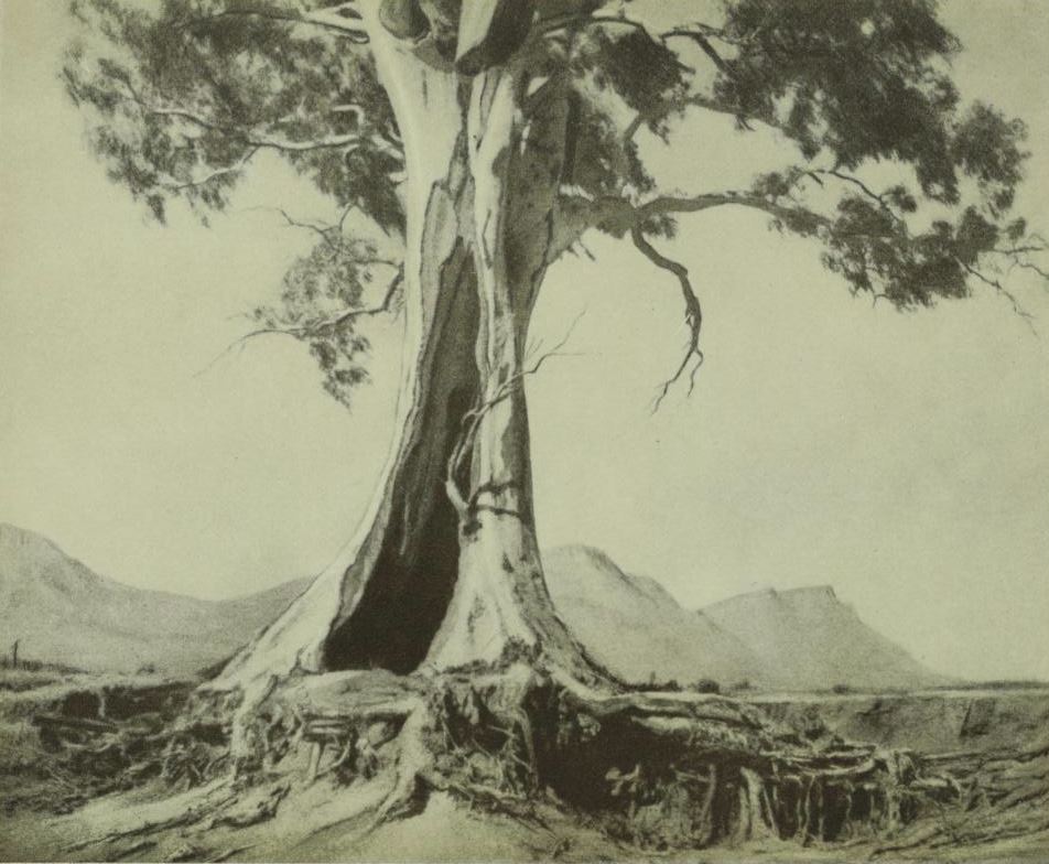 The subject of this famous picture still stands at Wilpena in the Flinders Ranges of South Australia where it has become known as ‘The Cazneaux Tree'. It has weathered storm, flood and fire and the picture shows that the tree still possesses a strong element of defiance. It was welcomed at every exhibition to which it was submitted. Incidentally the negative has been laterally reversed with a view to developing stronger impact.
