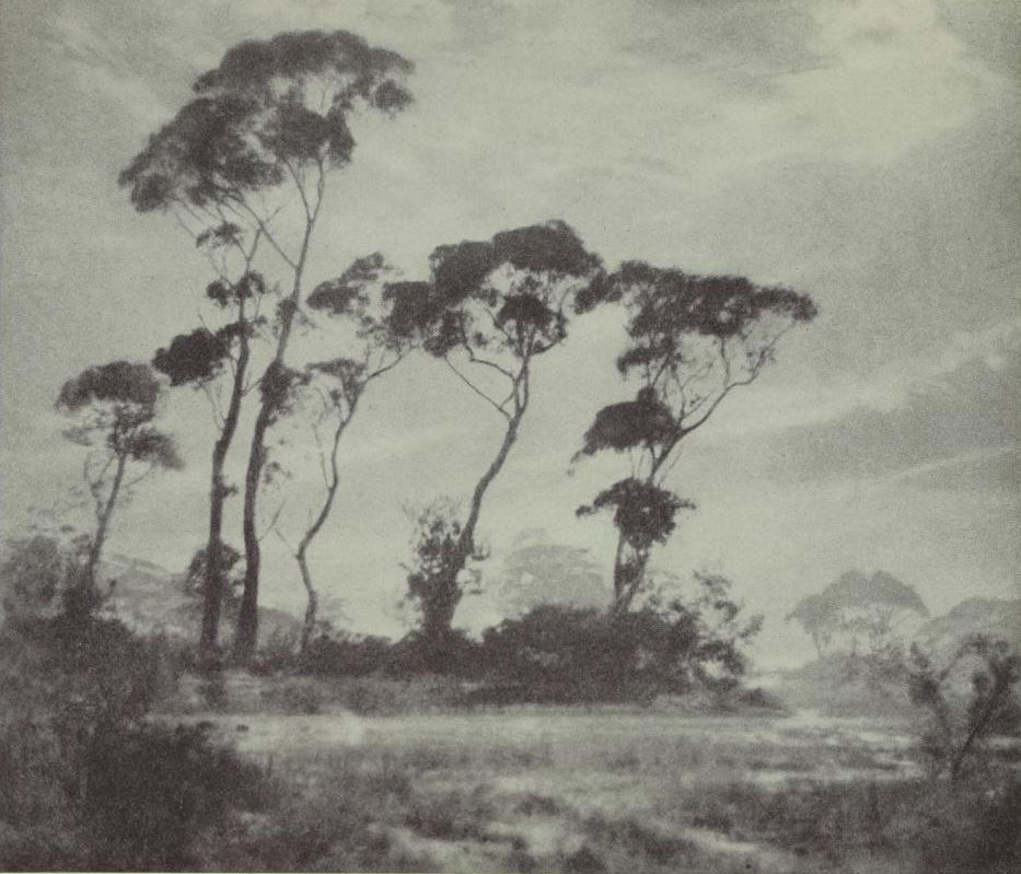 A year or two back we saw a charming new little book of Ure Smith’s entitled "Treescapes" illustrated by Caz. In the introduction Arthur Streeton says “The prints by Mr. Cazneaux put all our paintings in the shade. His choice of subject, his splendid instinct for design and light and shade certainly put him as an artist above almost all our painters. No one has represented trees in any way comparable with those in his prints. He is a landscape man of the first water. He has a great gift”.