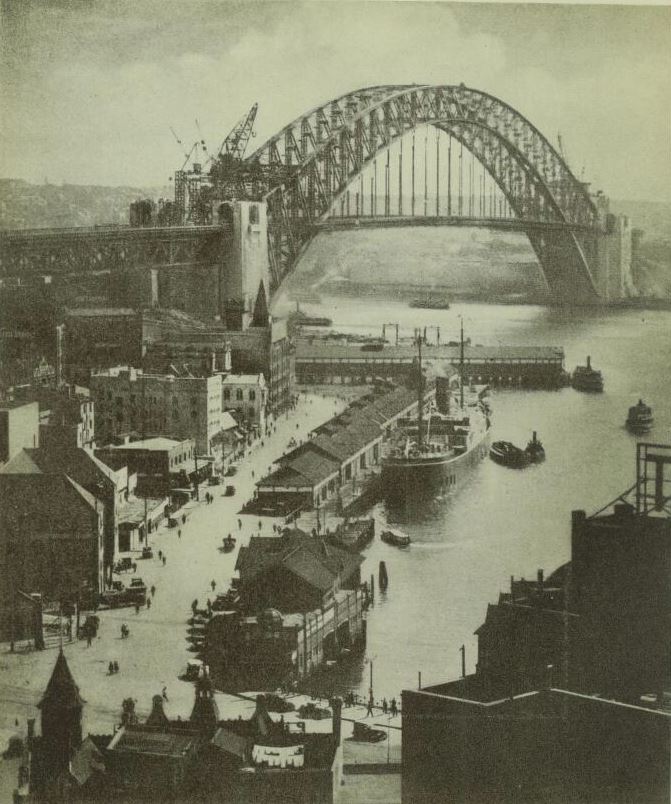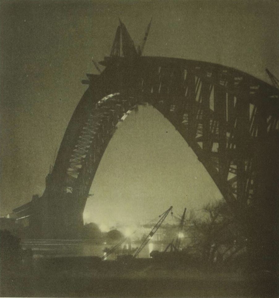 When ‘The Bridge Book' (of my photographs) was published in 1930 by Art in Australia, this picture was chosen for the cover. It was later shown at the London Salon. Photographed with a stand camera and f/6 lens, the subject required an exposure of many minutes. It was necessary to cover the lens a number of times as the moving ferry boats passed under the arch.