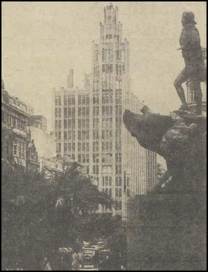 This is fairly simple, both in design and in method, but the impression of a streamlined, restless and high speed "tomorrow" is achieved by cutting through two upright architectural figures (uncompromisingly severe) by the geometric lines of a modern office building.