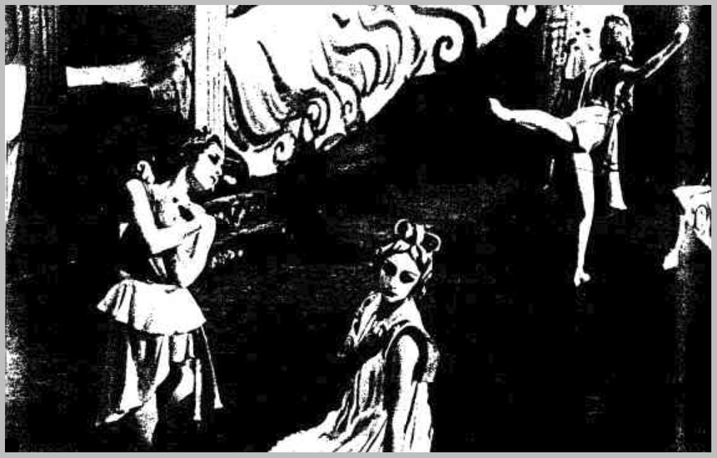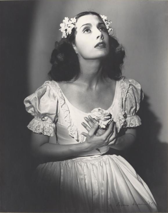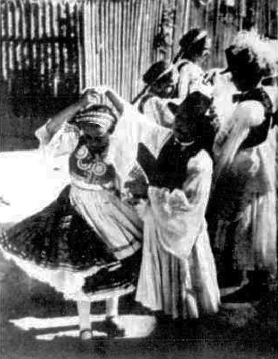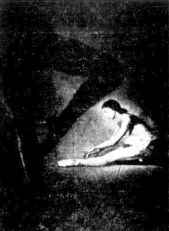 Double exposure has produced a striking picture which symbolizes the high speed pirouetting of a ballet dancer by framing her figure in a swirling network of lines of light.
