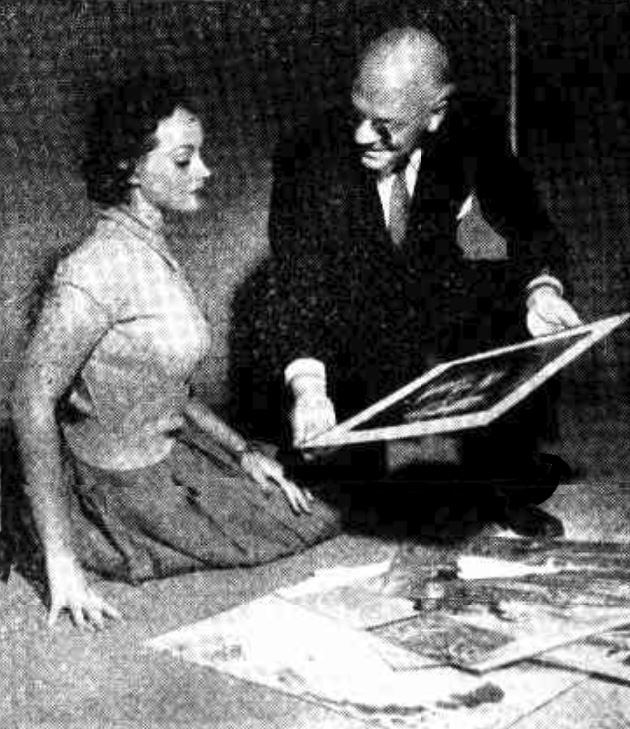 PRINTS FOR DISPLAY next week at the Victorian Salon of Photography were being arranged yesterday at the Lower Town Hall. Here the president of the Salon (Mr. A. Dickinson) is looking over some exhibits with Miss Jeanette Elphick, model and 3AW teenage quest entrant.